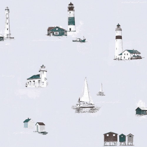 Papel de Parede - Deauville 2Papel de Parede Deauville 2 G23311Papel de parede, barquinhos, casinhas e farol com fundo azul..