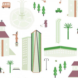 Descrição: PAPEL DE PAREDE COM ESTAMPA DE CIDADE nas cores verde e marrom COM FUNDO BRANCO