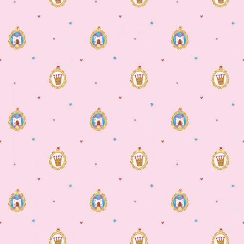 Peso Caixa: 1300 Origem: Importado Área de Cobertura m2: 4,5m² Tonalidade / Cor: Rosa e azul Estampa: Princesa, coroa Descrição: Papel de parede com estampa de coroas e castelos, nas cores rosa e azul
