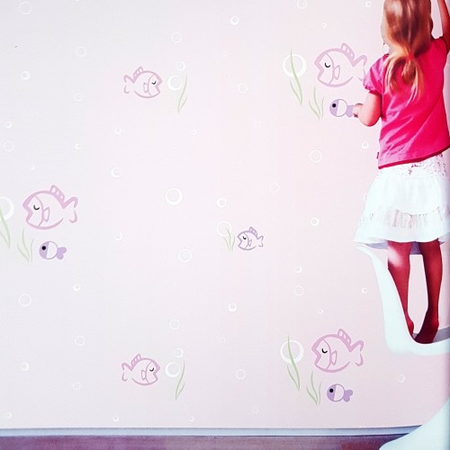 Papel de parede decorado infantil, peixes, rosa.
