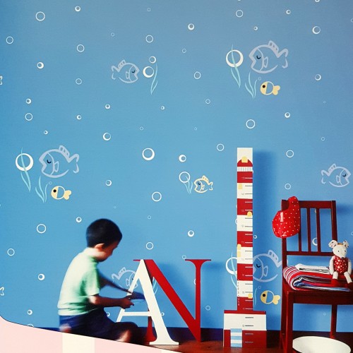 Papel de parede decorado infantil, peixes, azul.