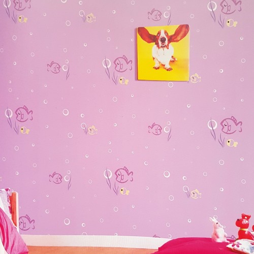 Papel de parede decorado infantil, peixes, lilás.