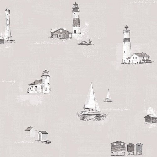 Papel de Parede - Deauville 2Papel de Parede Deauville 2 G23314Papel de parede, barquinhos, casinhas e farol com fundo cinza..